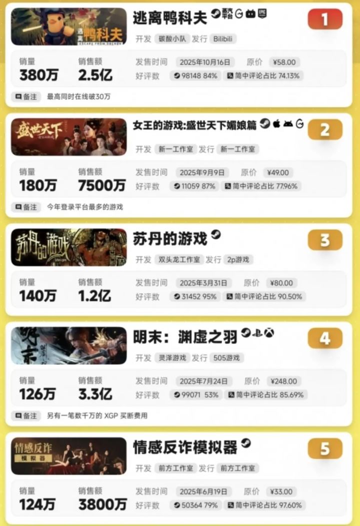 榜单头部竞争激烈,B站发行的《逃离鸭科夫》成最大黑马,以380万份销量、2.5亿元销售额登顶。