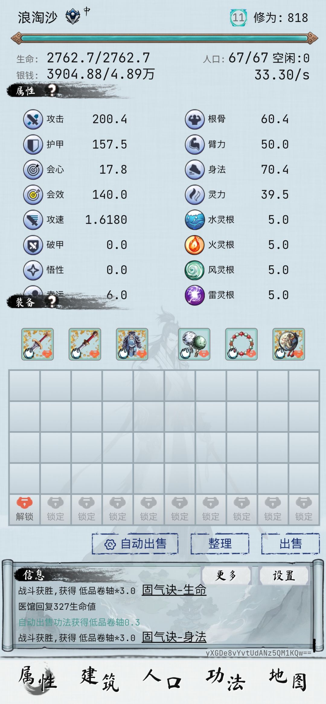 【功法】逆心转脉,天养生息法,乾元攻—生命,珍品—会心,加上往生咒。充钱开了的多带一本护甲。