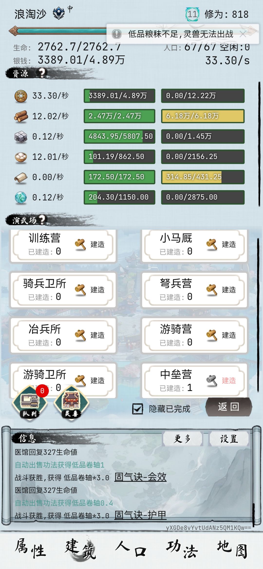 另外好像没啥别的内容了,前期先点生产,人口,仓库,后面再点功能里加属性的。合理分配人口也没啥好讲的。另外就是演武场能不点就不点,节省资源。如图: