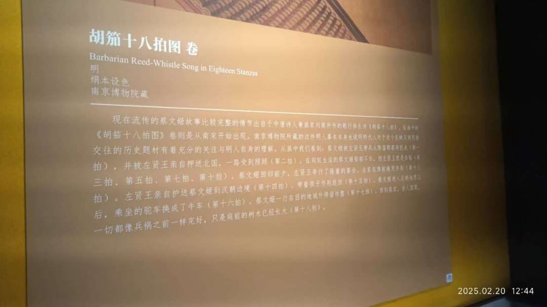 去年2月在南京博物院恰好见到了明代的《胡笳十八拍》图卷。从南宋时开始,古人就不断地绘制她的故事。此后中原大地上因战乱而奔波流离的人们,会不会在某一刻也同这位百年前的女性共悲愤,期待着有生之年能再回到阔别多年的家乡,即使那时“白骨不知谁,纵横莫覆盖”?