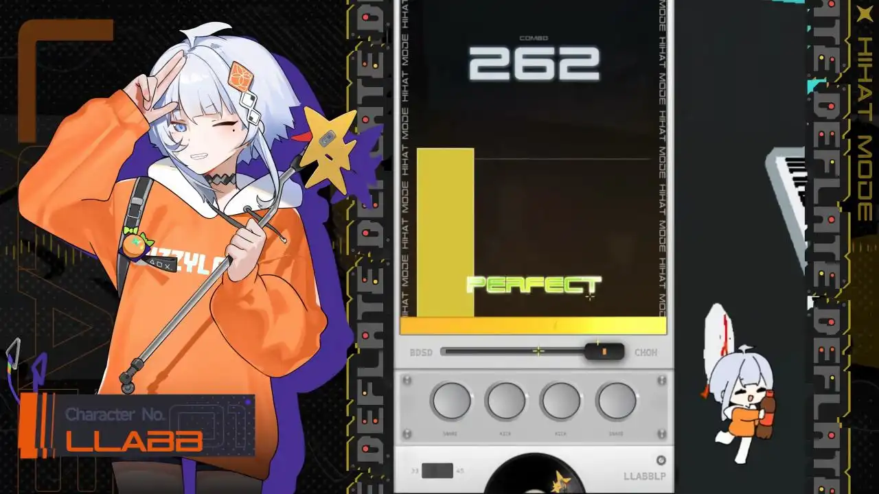 《DEFLATE 音序真空》还准备了多位可选角色,并且每一位都有各自款式的经典鼓机以及独特敲击音色,这些立绘我还是挺喜欢的。尤其是909老婆~嗨嗨~