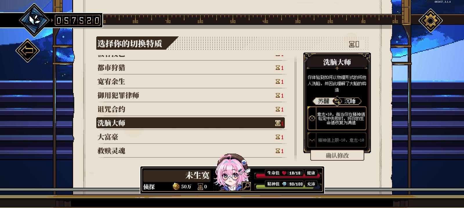 开局降低到20,让洗脑大师处于觉醒沉睡意志-10(卡森德拉模组获得),让病痛缠身处于觉醒意志-5(幕间研习流浪市井失败获得)。先去幕间度假中的荒野求生(这个建议开局吧运动拉满荒野求生有运动鉴定成功失败的)将意志加到55,再将两个特质反转效果都变为+10