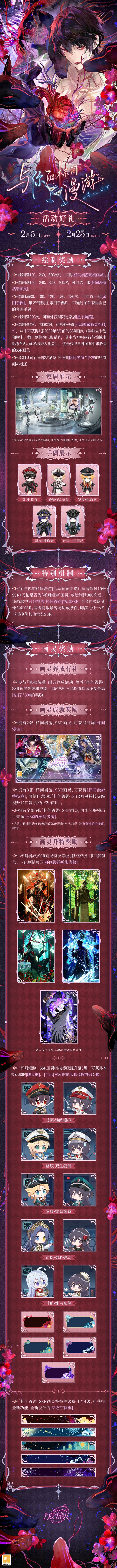 ★2月5日更新后 - 2月25日05:00,全新「与你的杯间漫游」活动画廊限时开启。活动期间,艾因SSR[符号裂隙]、路辰SSR[蔓生虚像]、罗夏SSR[落差娱戏]、司岚SSR[永坠无间]、叶瑄SSR[丝网缚生]获得概率提升。画廊具备许愿功能,活动结束后,以上画灵暂无获取途径。
