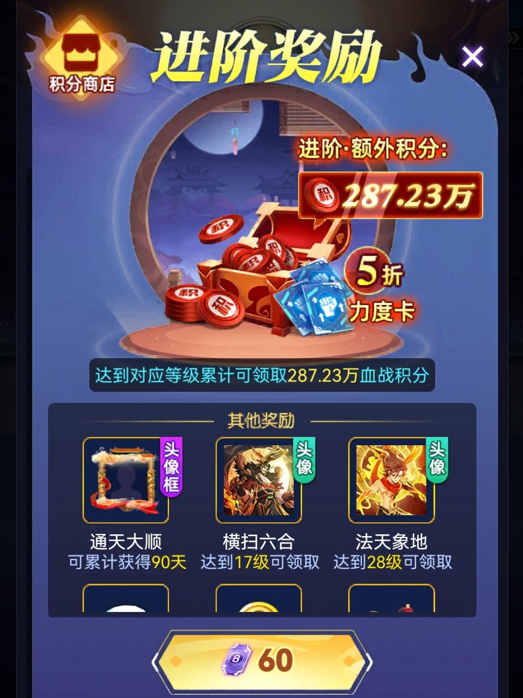 随着赛季延长,解锁进阶奖励也调整为60点券,整个赛季期间可享受力度卡5折优惠~