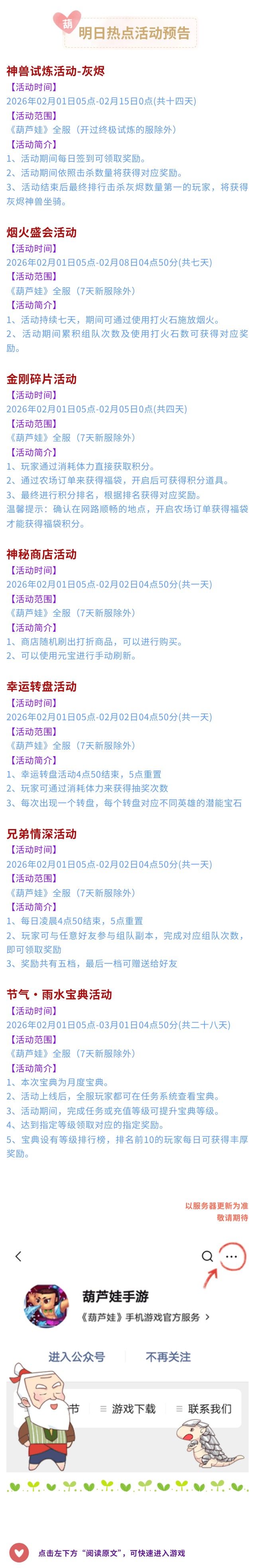 【葫芦娃】2月1日活动预告