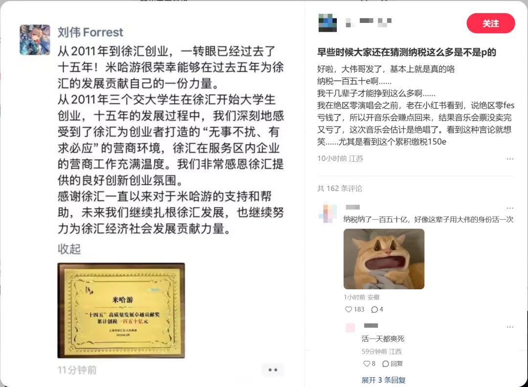 米哈游联合创始人刘伟(人称“大伟哥”)在朋友圈晒出牌匾,米哈游于2021至2025年的“十四五”期间,累计为徐汇区创税150亿元!