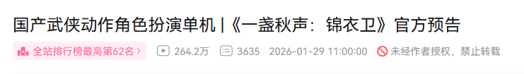 没想到继《影之刃零》公布发售日后没过多久,又一部国产武侠动作游戏《一盏秋声:锦衣卫》发布了官方预告,两日在B站便收获了263万播放量。