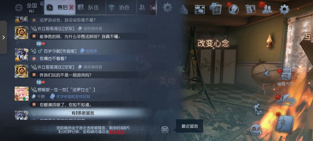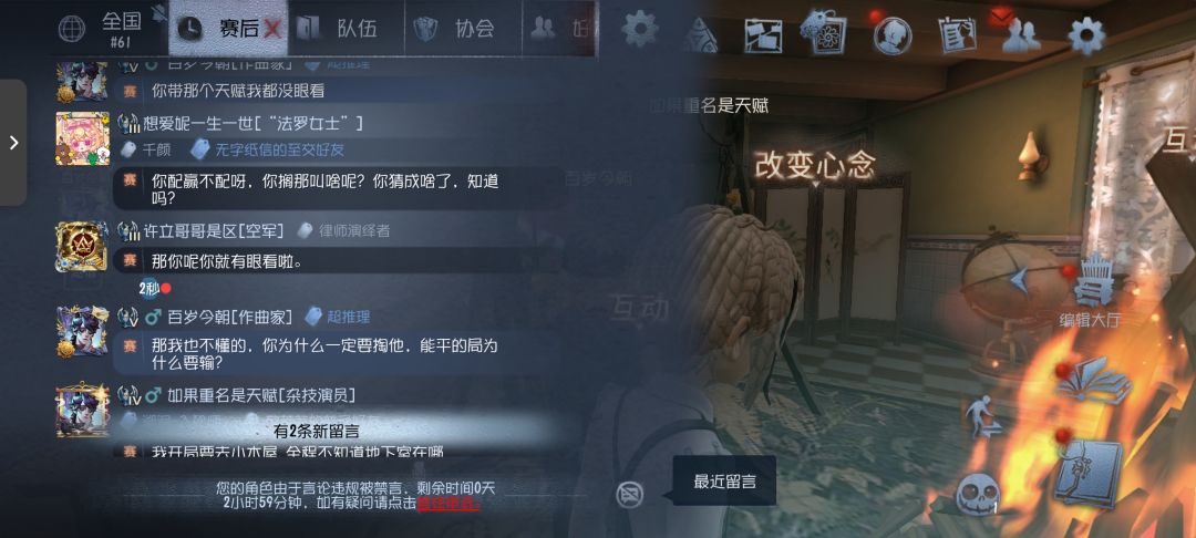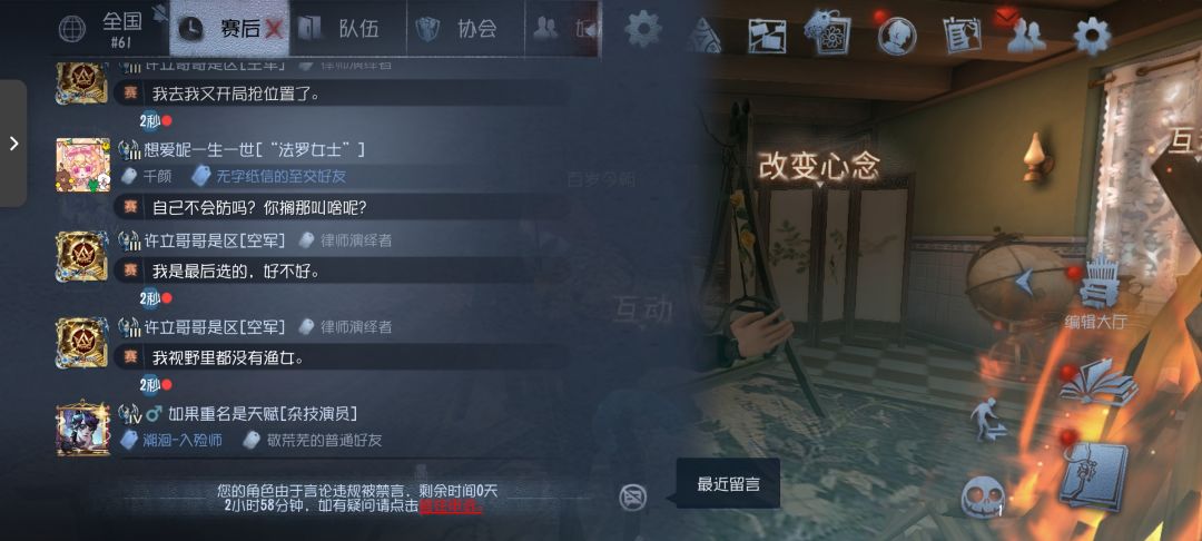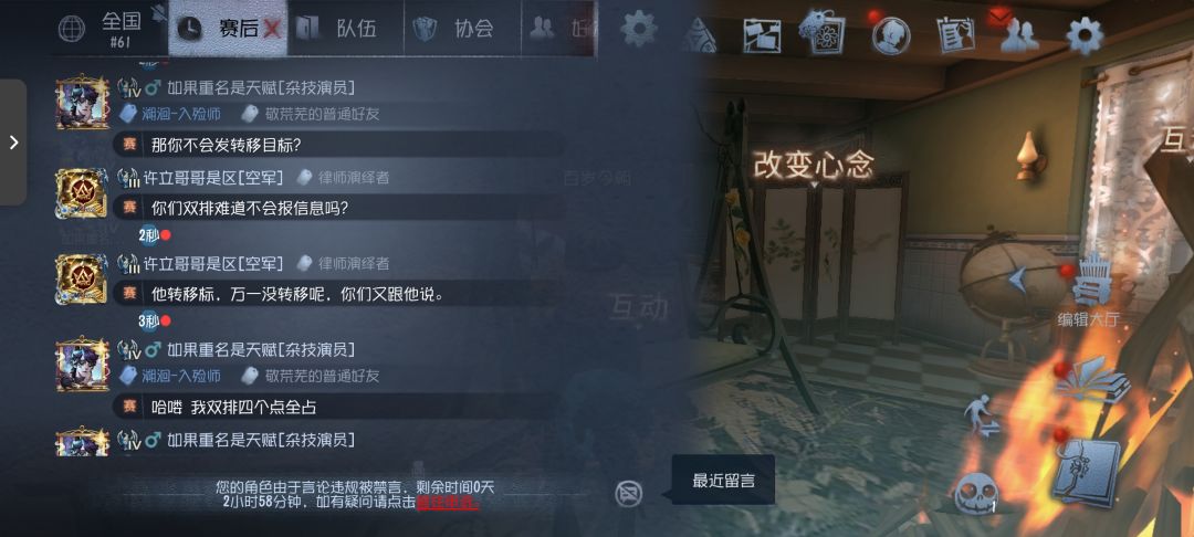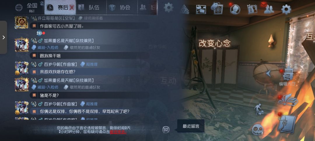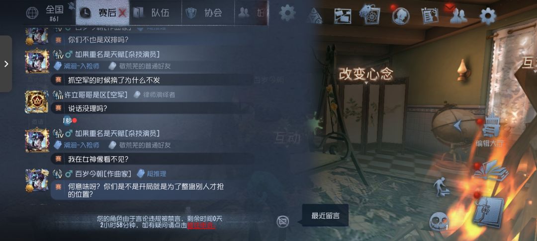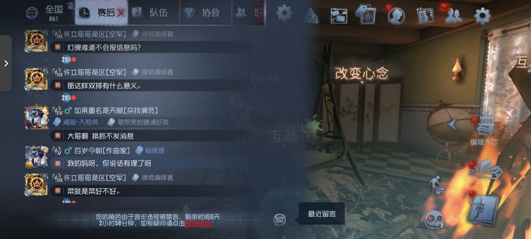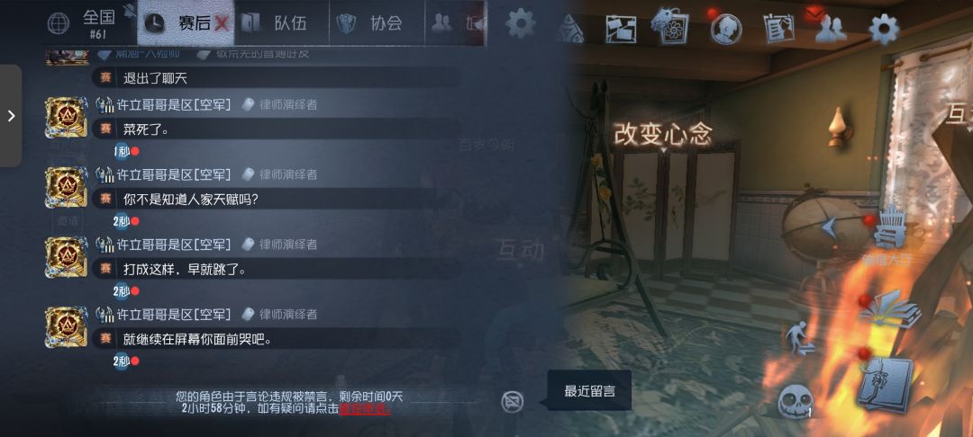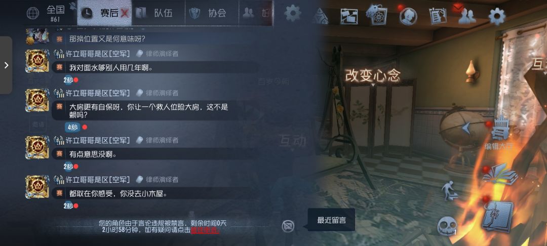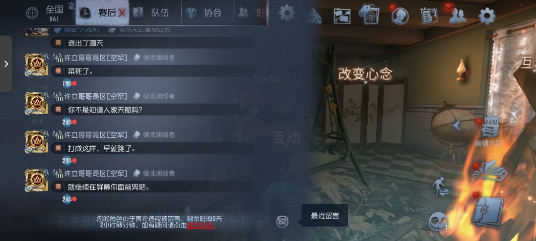 第五,我说白了,你家里都少点啥的,举报审核你一点也不看对吗?发两句何意味不骂不说啥的,直接就胡乱禁言,想怎样,对面追着骂都不禁言,发何意味不骂对面都禁言,法罗没带大心脏不发天赋,我也不知道他这个双排队友是想咋的,上来直接赛后我们来,说不过就举报,本来能平局,咱也不知道这空军是哪根筋犯错了,非要去掏法罗,我和我另外一个朋友也是双排,说我和我朋友有信息差,当时我在被追,我也发信号了。反倒是法罗一直不发信号,开局的时候我朋友选的小木屋,法罗就要和我朋友换,我朋友换了以后孔军又要和法罗换,换了以后,空军又没有选小木屋,我还没有抢到小木屋……