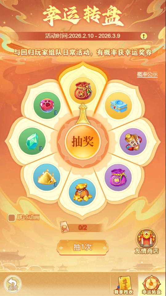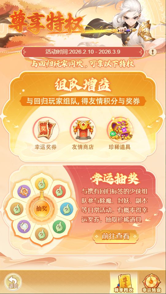 1.春节活动期间与携有回归标签的少侠组队,有机率掉落幸运转盘抽奖券