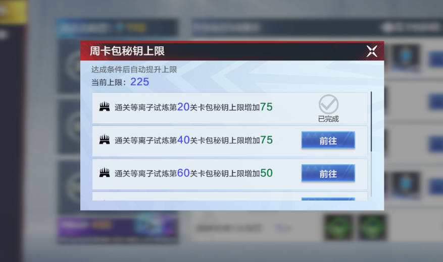 不过可以通过打等离子试炼提高获取上限,当前每周秘钥获取最高上限为500,前置条件是需要把等离子试炼打到120层。