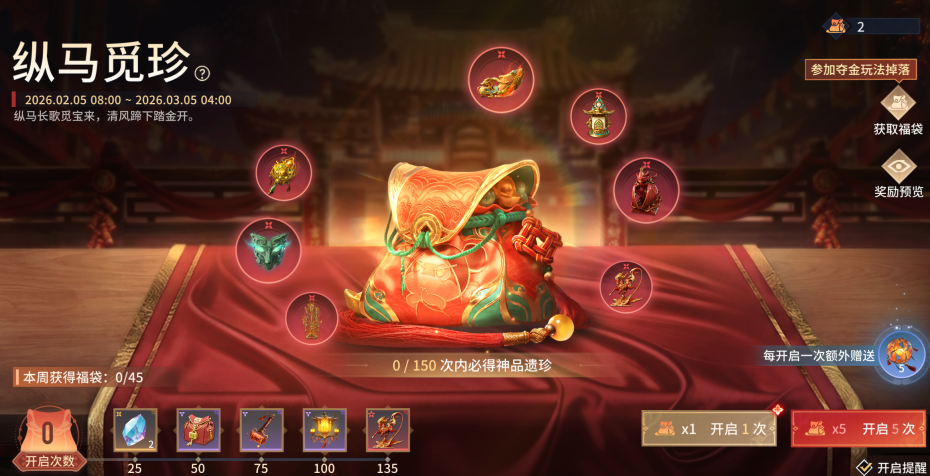 摸金开福袋,领瑞玉宝箱任选礼*1、神佑宝灯*1,更有马年限定神品遗珍奖励!