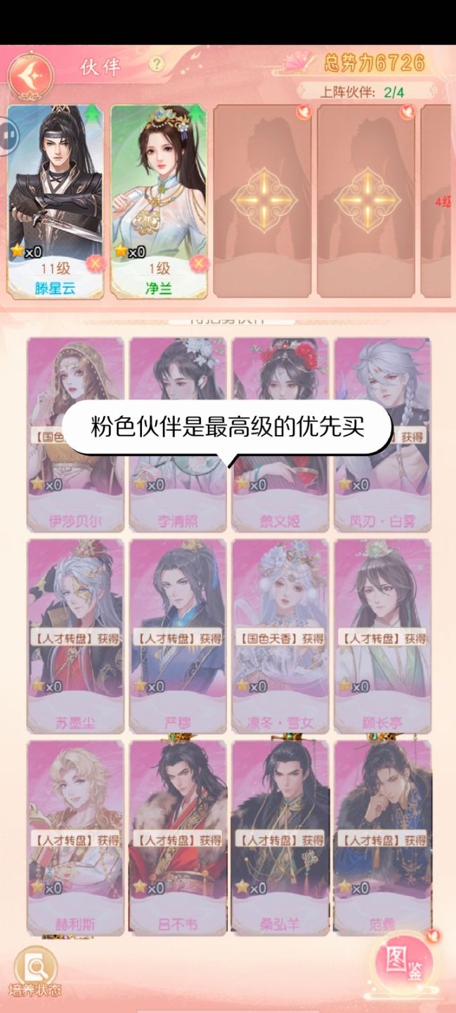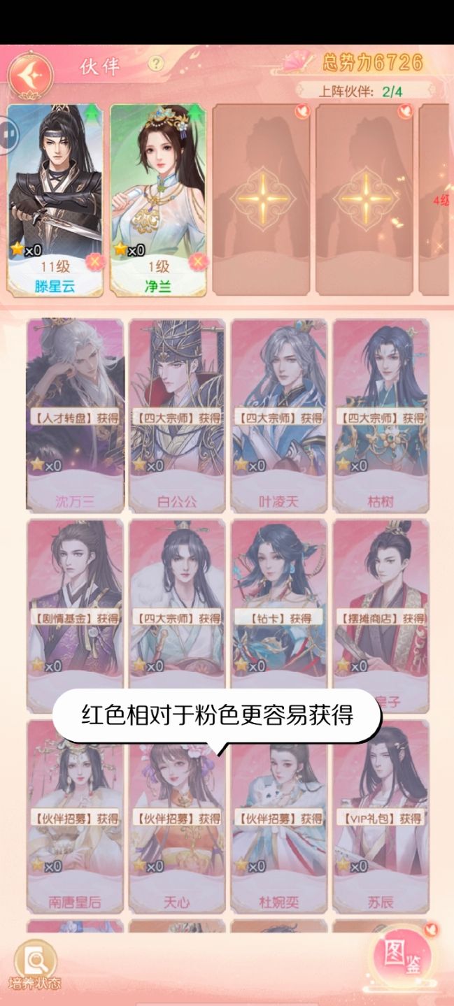 p10-11 伙伴对属性的加成非常大,粉﹥红﹥橙,粉丝最优先,但是凑到一个需要时间,前期没有粉色可以先去招募伙伴里面抽红色和橙色,前期基本上就是主养红粉色,如果红粉全部上阵了还有位置可以养橙色(上阵就养,不上阵不要养)