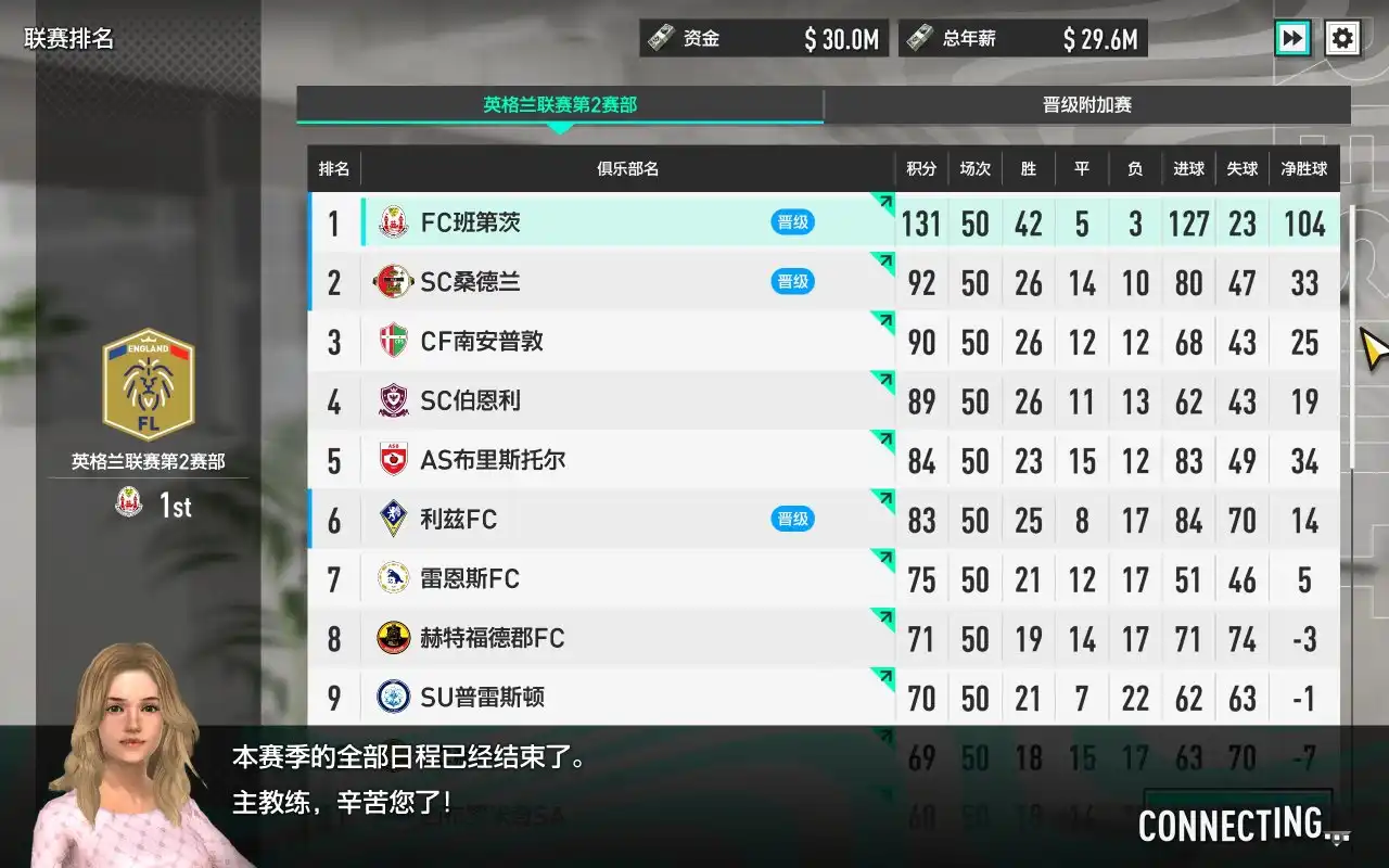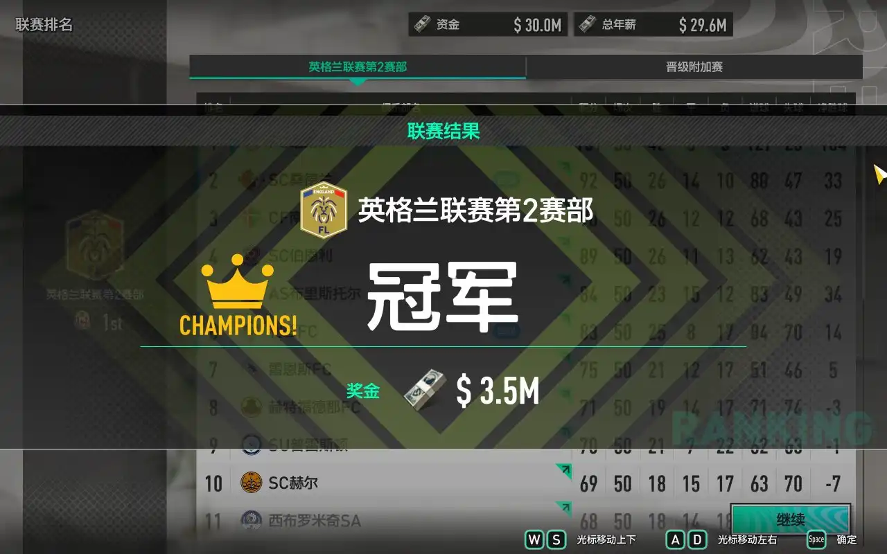 随后更是在第二赛季中成功在英格兰联赛第2赛部以断档第一的积分夺得冠军。