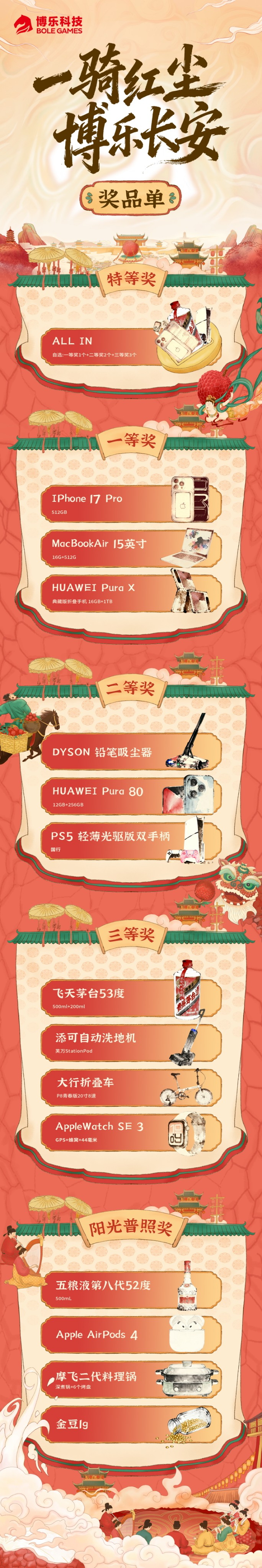 出海棋牌厂商博乐科技推出了“ALL IN特等奖”,一人独享自选一等奖1个+二等奖2个+三等奖3个的超级大礼包,一等奖是Mac Book Air、iPhone 17 Pro、华为Pura X。