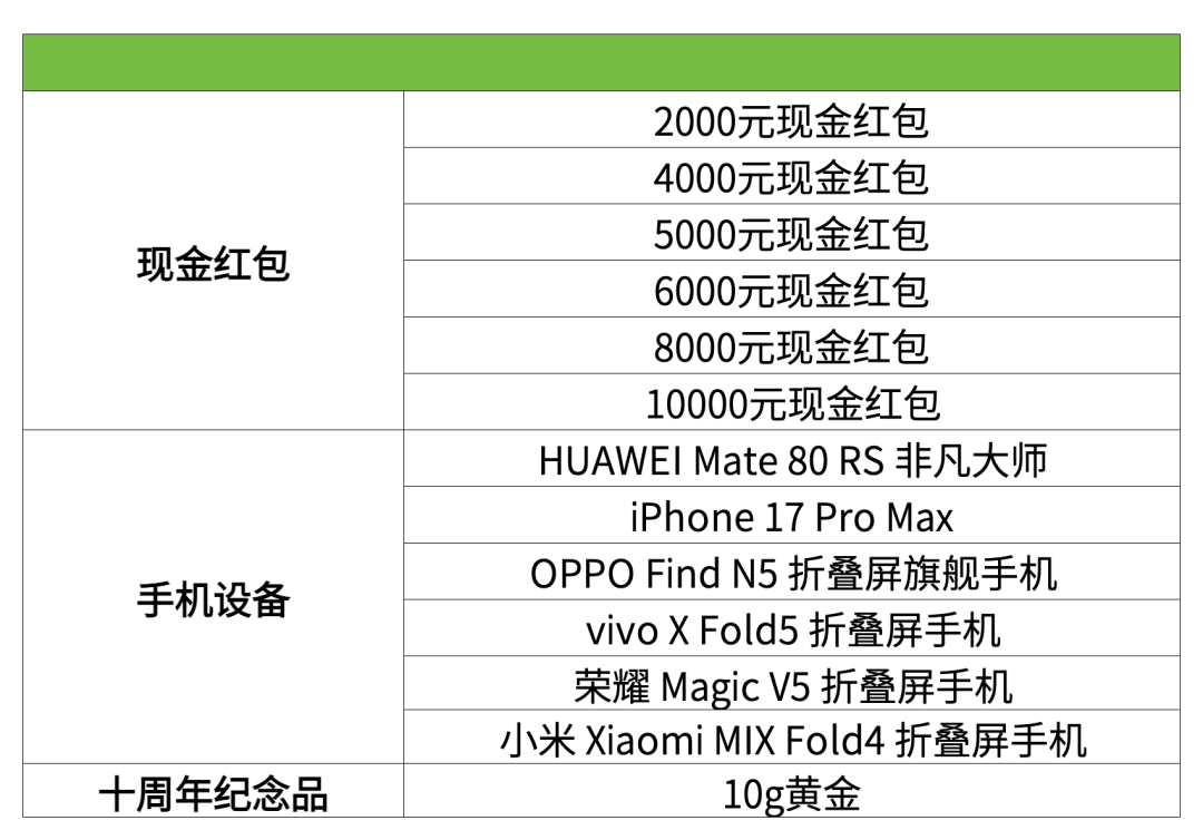贪玩游戏有最高10000元现金红包,手机奖品最高奖是华为Mate 80 RS 非凡大师;十周年之际,公司还为部分员工发放了10克黄金纪念品和定制手表。