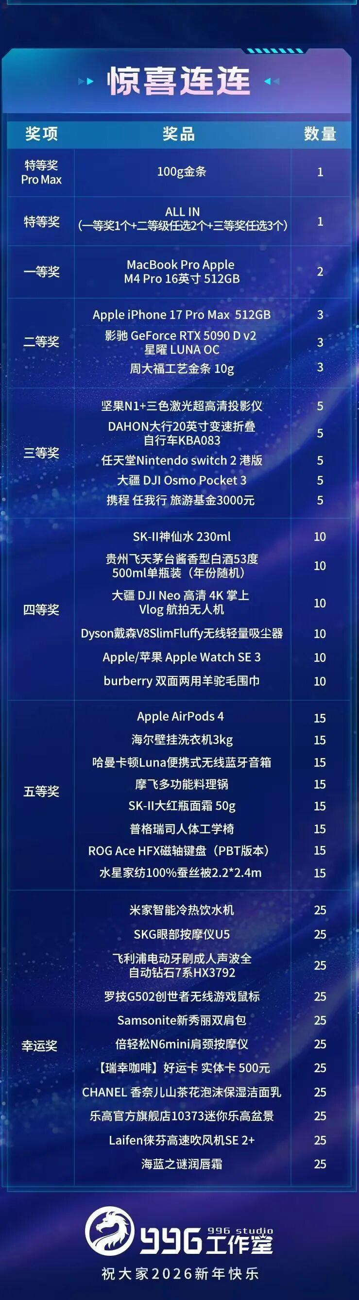 盛和网络旗下996工作室的“特等奖Pro Max”上了100克金条,按目前金价算,价值10万元以上。其他奖品除了显卡电脑手机这种常驻奖,还有飞天茅台这种硬通货,护肤品、茶叶、家电也琳琅满目。