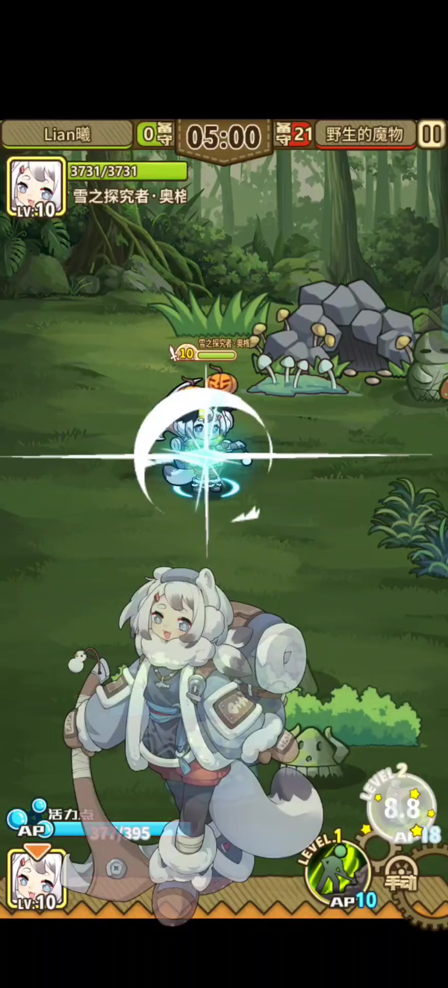 评价:奥格在自动释放技能时的输出表现相当羸弱,没有力量。因为小奥格的自动意愿并不是很高,即使释放了也基本是给队伍里聚怪的,5次打击点太过于分散,难以发挥低冷却优势。假如我们对5次250%范围伤害采用适当操作进行集火,奥格就变成了5.25秒一发1250%群伤+200%x5单体真伤的超强打手。如下(录制时为一破)