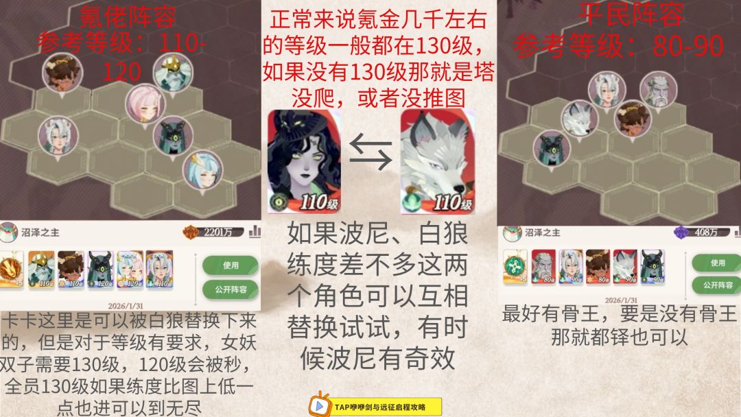 总的来说沼泽之主需要角色骨王来出分,如果没有骨王那就只能用都铎,由于狐狸太强甚至可以尝试提前下卡卡,上白狼来打输出,还是要看个人练度来决定要不要这样上。