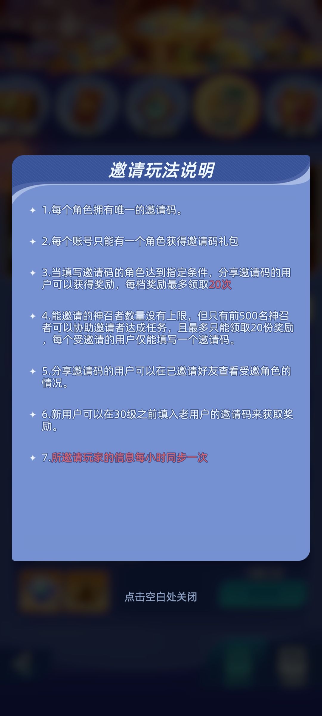 邀请人数不上限,但只有前500个玩家才能让你拿到奖励,每档的奖励只能领20次,这些奖励在前期看起来多吧,但是又不是那么重要,主要是极度费时费力,而且影响风气,导致大量新入坑玩家退游。