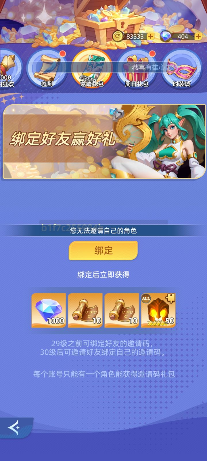 1.30级之前互绑邀请码(20抽+1000钻石+50英雄碎片)