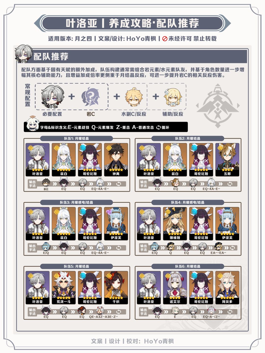 ●叶洛亚基于固有天赋中的额外精通转模条件,队伍构建通常组合岩元素/水元素队友,并基于相应的角色数量进一步提升精通转模的辅助收益,而由于倍率更多侧重于月结晶反应,因此以月结晶的反应为基底搭配哥伦比娅,可稳定增益岩C的输出能力;