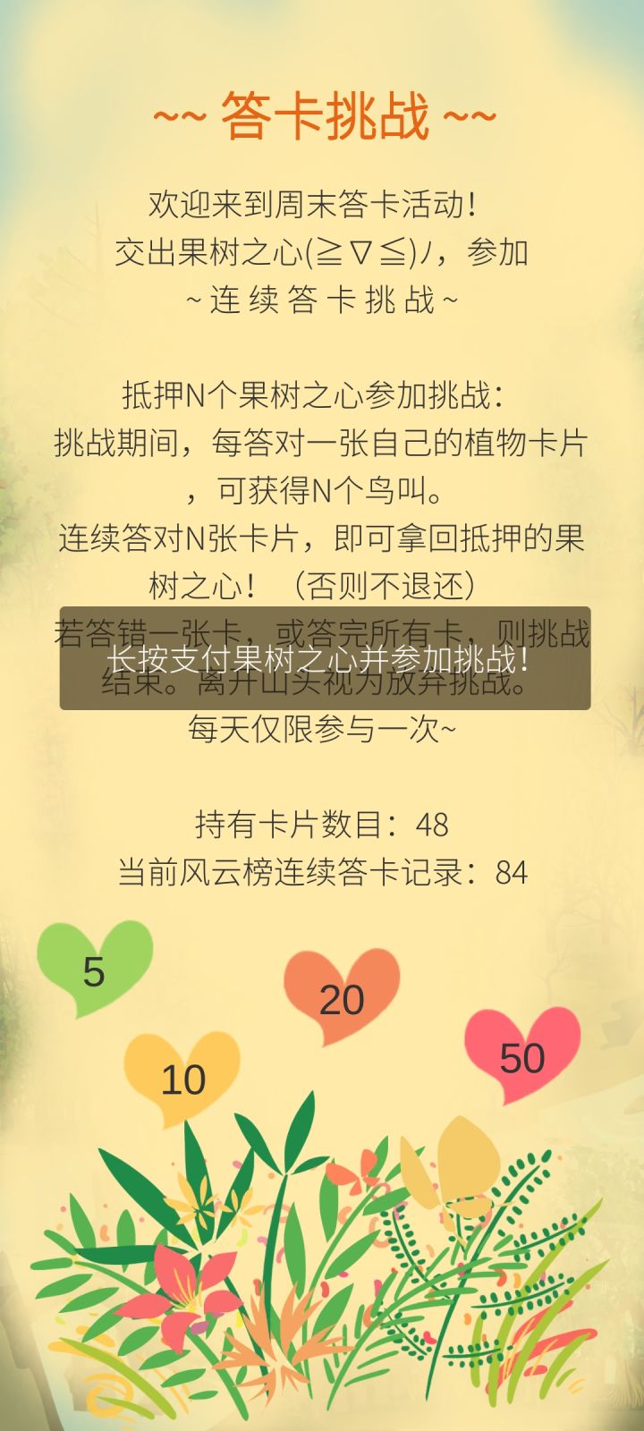 知道二月没有果期,那周末的活动也没办法支付果树之心参加了吗,长按了很久也没办法参加