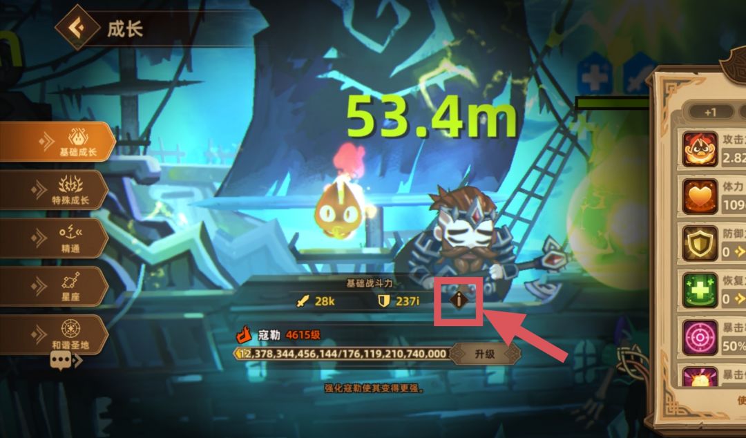 2,基础属性面板通过主页左下角成长→基础战斗力→详细说明(感叹号)进行查看,点击每一项属性旁边的展开三角可以看到详细计算方式。学会查看面板值是我们进行数值讨论的基础。