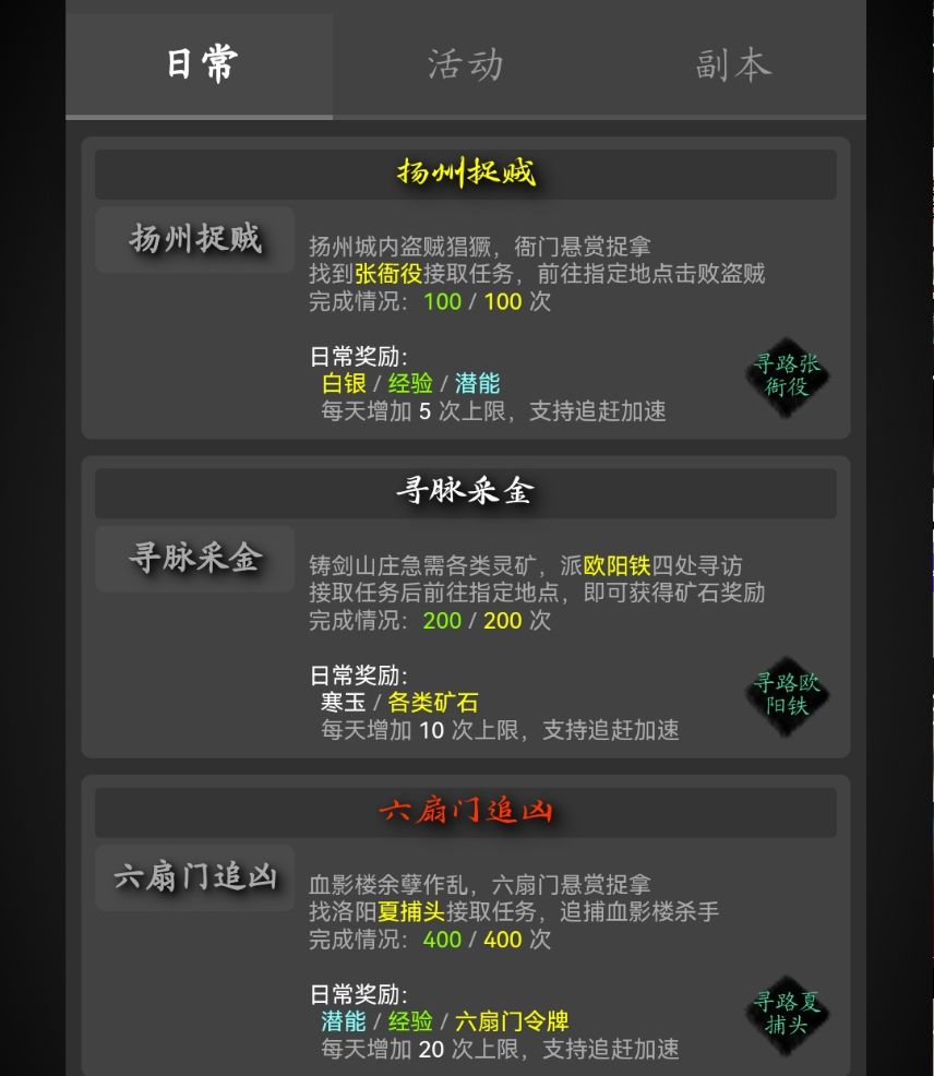 行走江湖从非一朝一夕之功,日常历练是固本培元的根基,副本挑战是突破瓶颈的捷径。每日里,师门委托、江湖缉凶、采集炼丹等琐事,看似平凡却能积攒内力、锤炼招式;而那些藏于深山古刹、地宫秘境的副本,藏着神兵秘籍与机关险阵,需对应方案方能攻克。今日便与你细说这两路进阶之道,助你稳步成长。