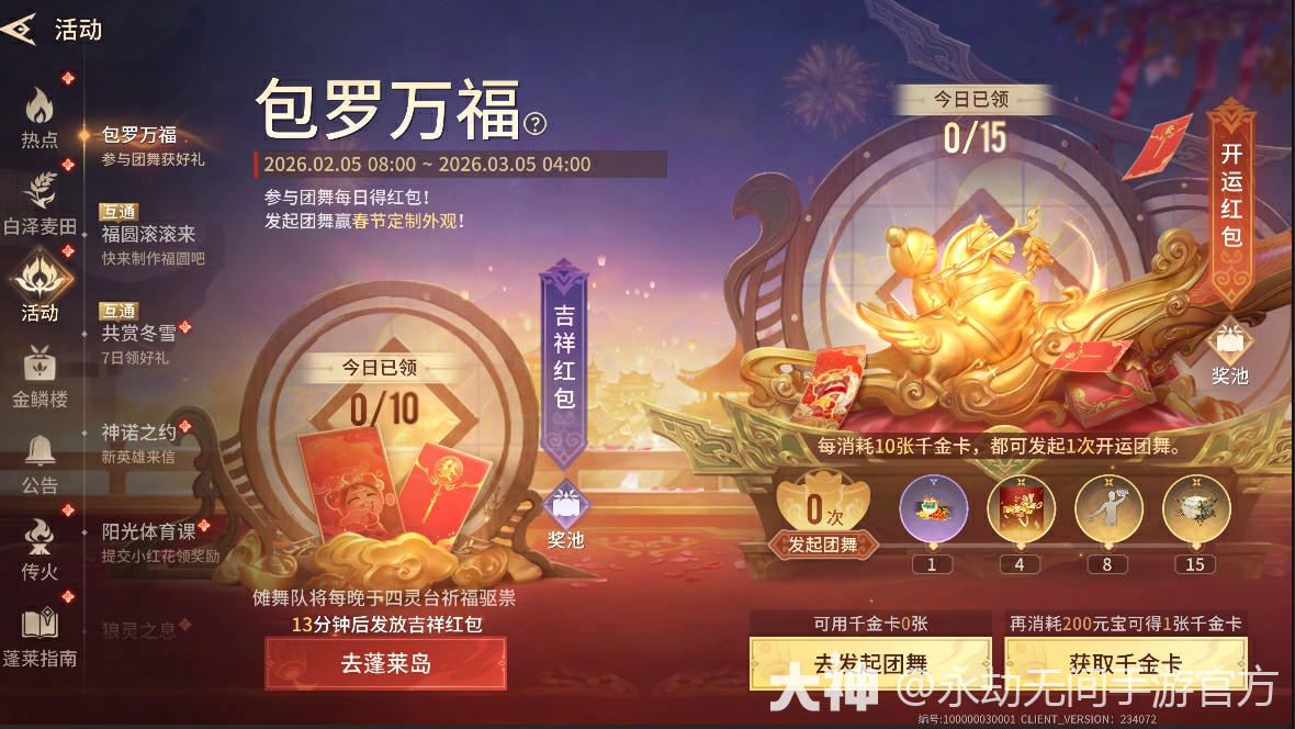 活动期间,系统每隔15分钟将在蓬莱岛发起【吉祥团舞】,跟跳团舞得红包。
