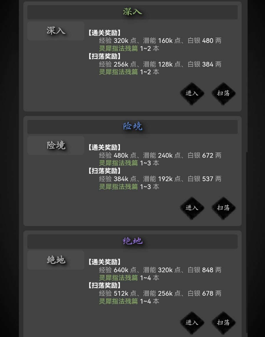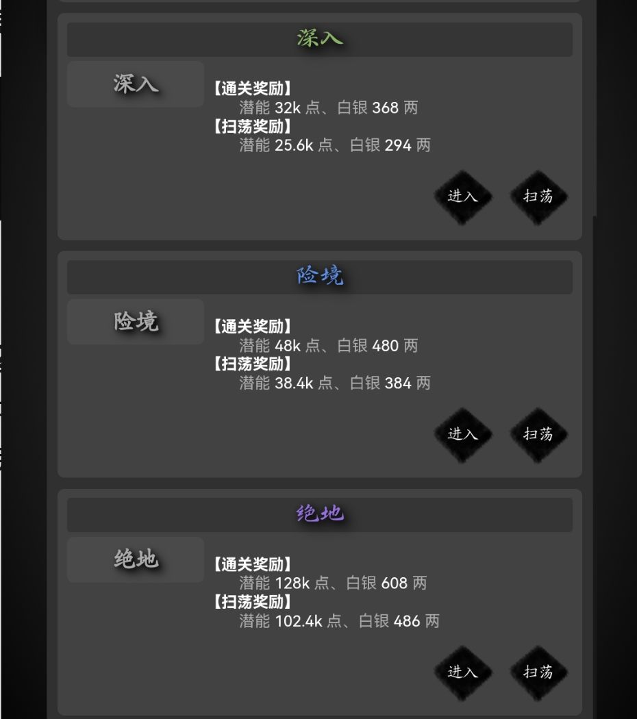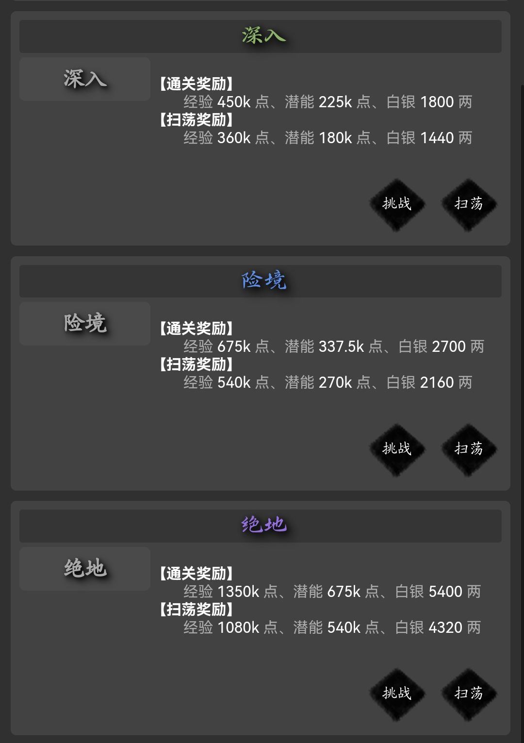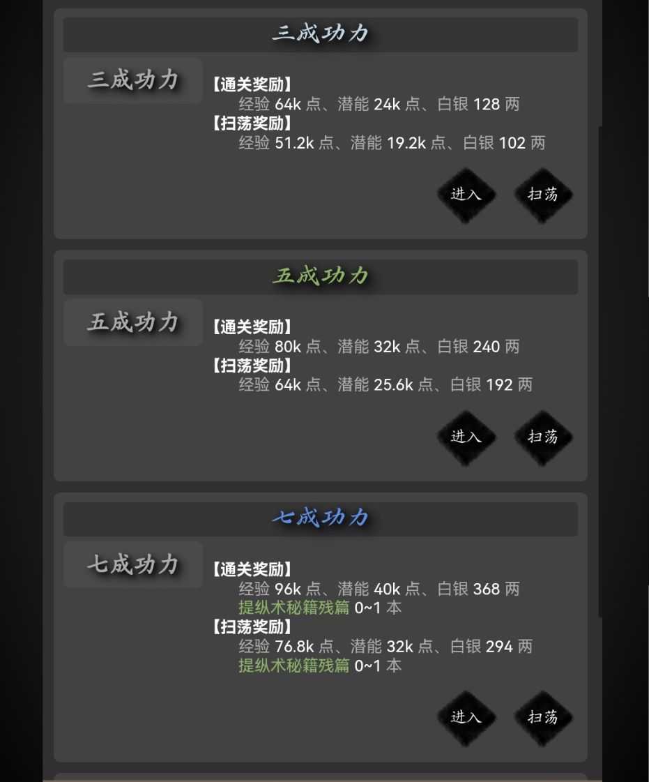 一共三成功力、五成功力、七成功力、十成功力四个难度,通关一次才能扫荡并解锁下一难度
