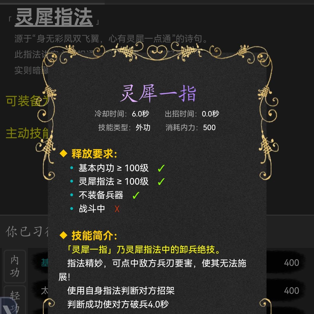 招式-灵犀一指 可以使敌人破兵4秒