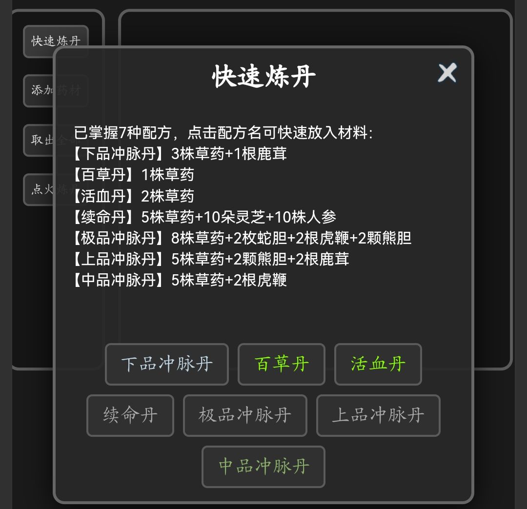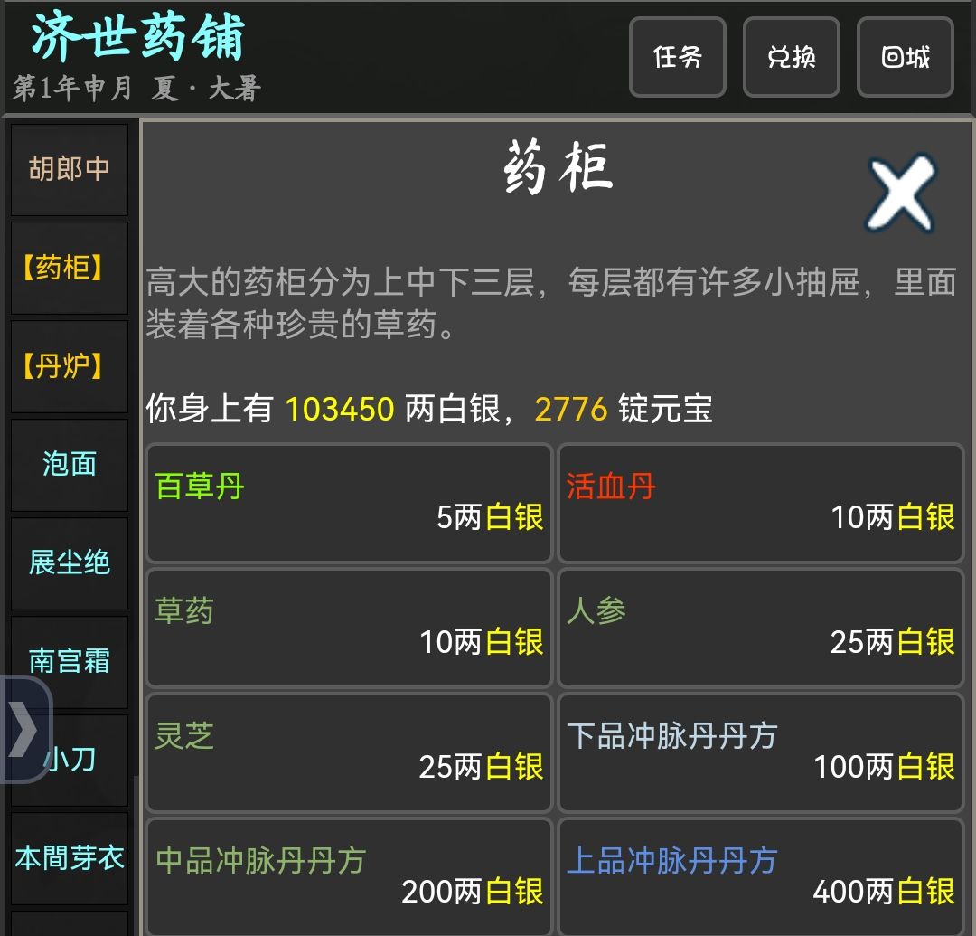 济世药铺先买20颗百草丹提高内力至1500