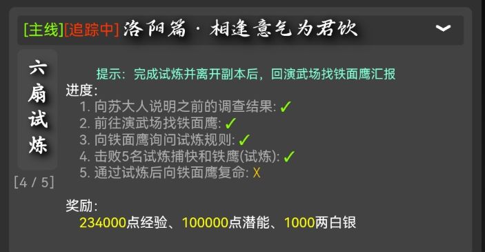 完成试炼并离开副本后,回演武场找铁面鹰汇报