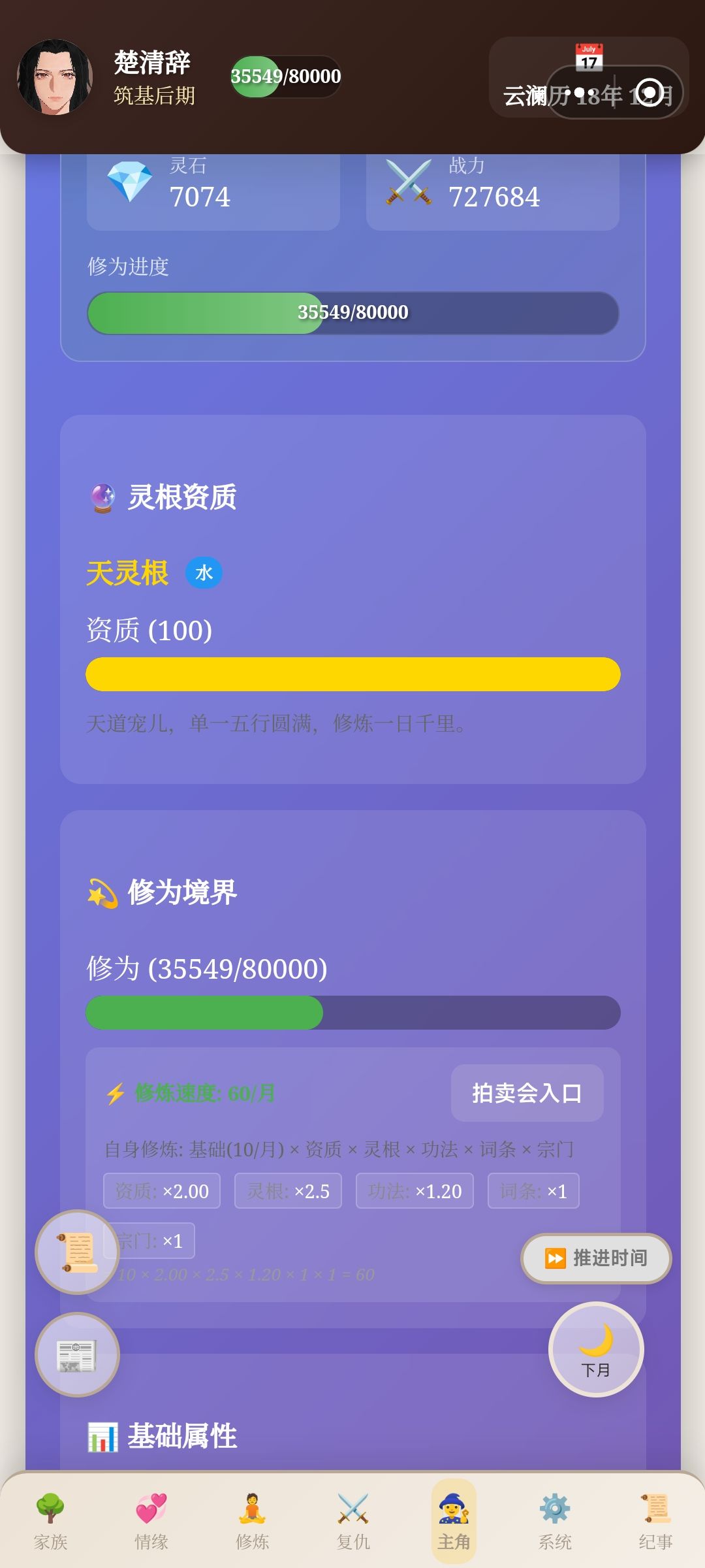 ❷资质就是灵根,初始资质是20,默认五灵根。
