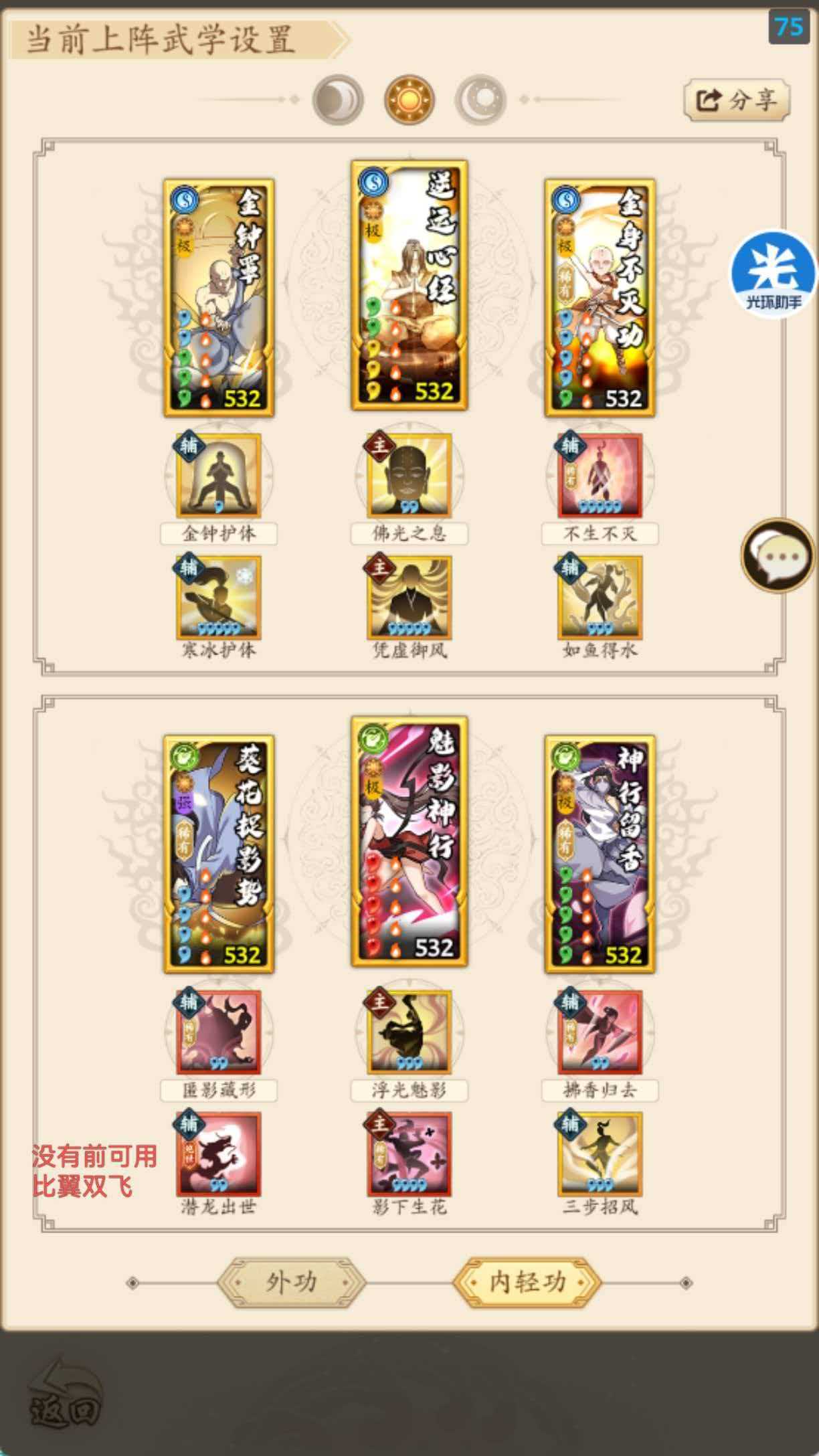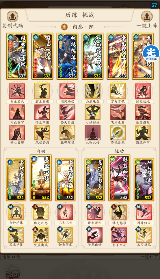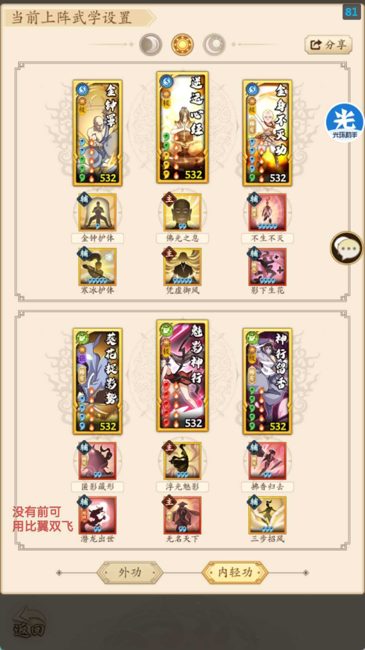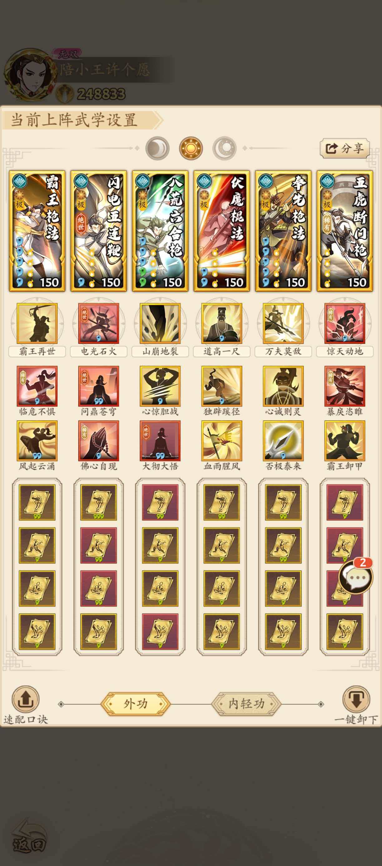 内功轻功方面,开区到武当阶段我分了两种,一种是平民版(无无名天下),一种是氪佬版(有无名天下)。开区到武当的套路都用这套内功。