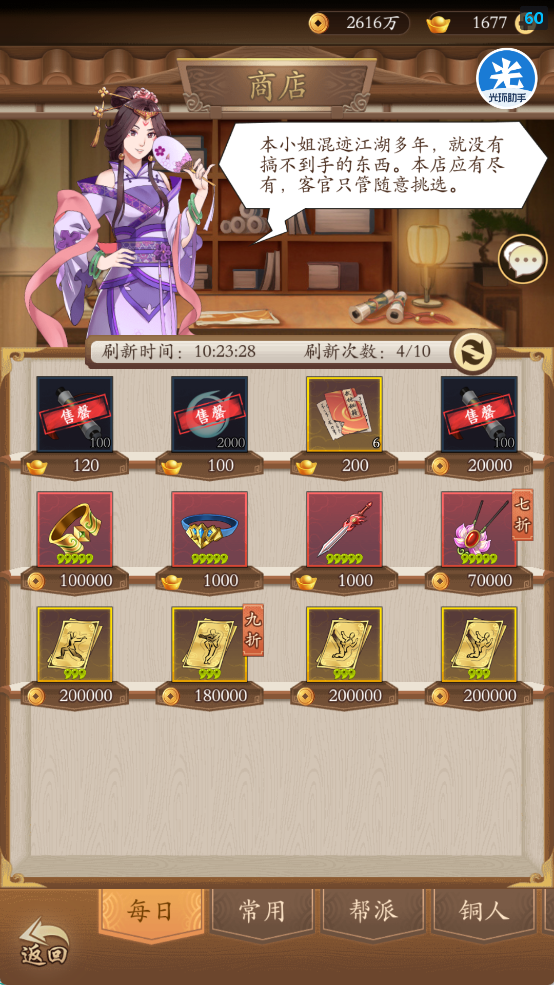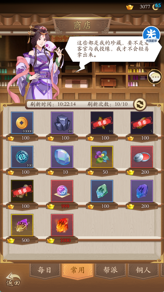 常用商店,正常情况下建议刷三/四次,淬锋石、砺金石,精要突破书必须买,有条件的可以刷6次。真气值这个根据自己元宝情况,如果元宝够也可以买一买,铜币同理,按需求买。