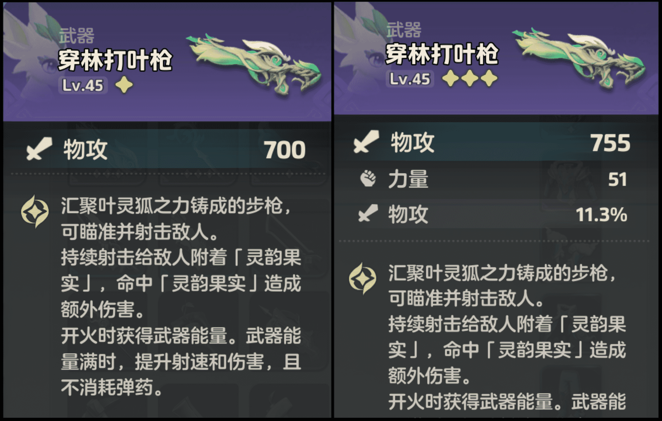 例如同样是45级武器的穿林打叶枪,1星只能获得700物攻加成;而3星不仅可以获得755物攻,还能提升51点力量和11.3%的物攻加成。