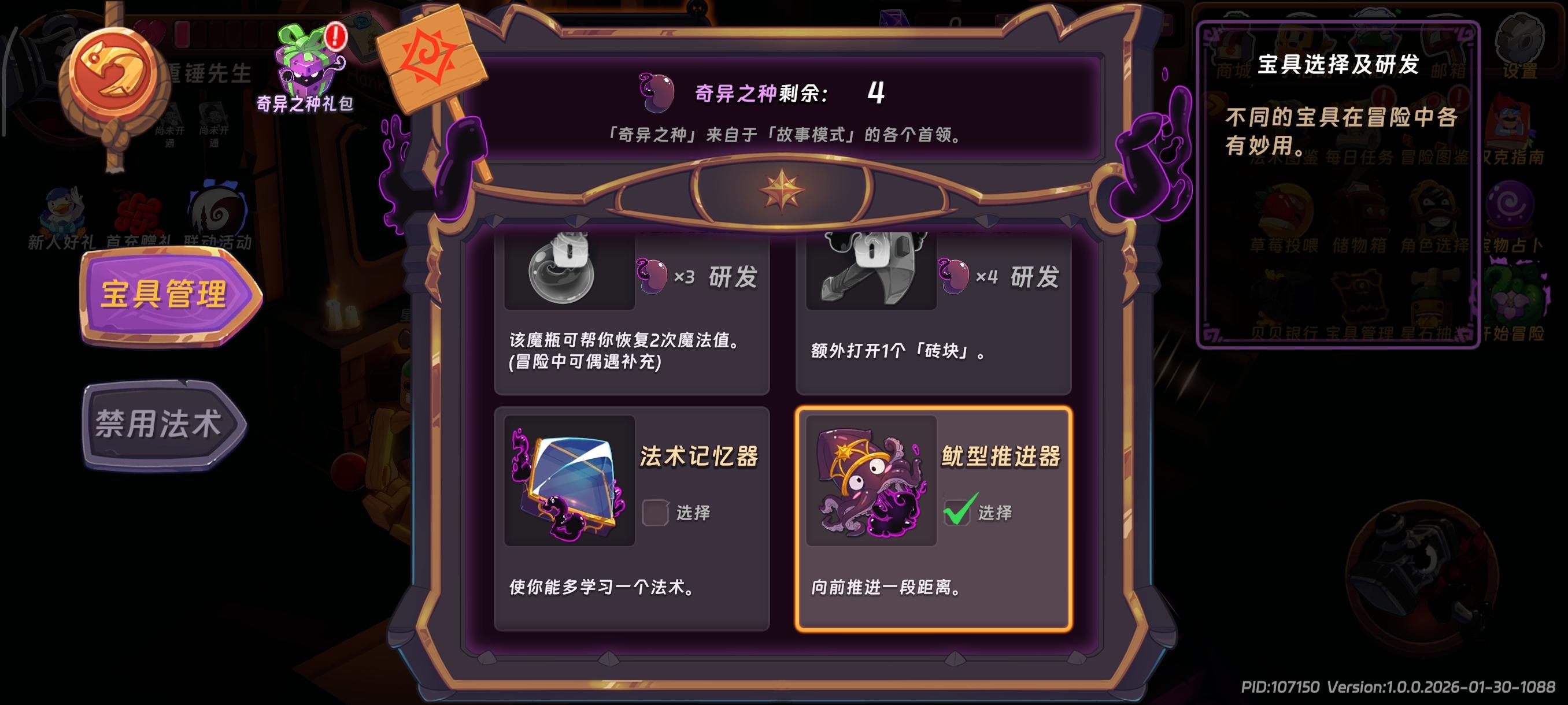 前期用「大头菜」,然后无脑解锁「鱿型推进器」,这个很重要,其他都不要管,这个可以给你一个小位移,躲攻击老好用了。