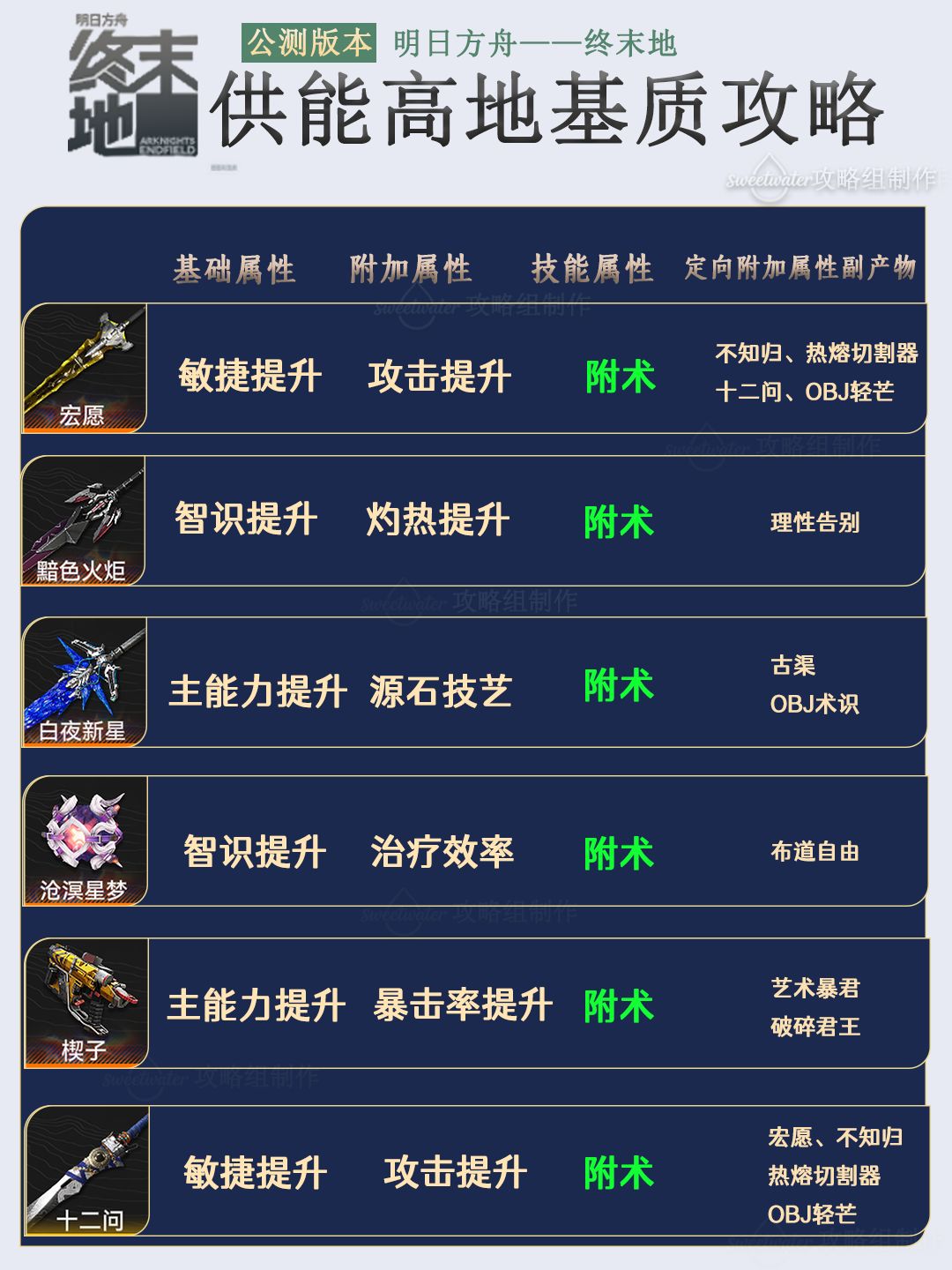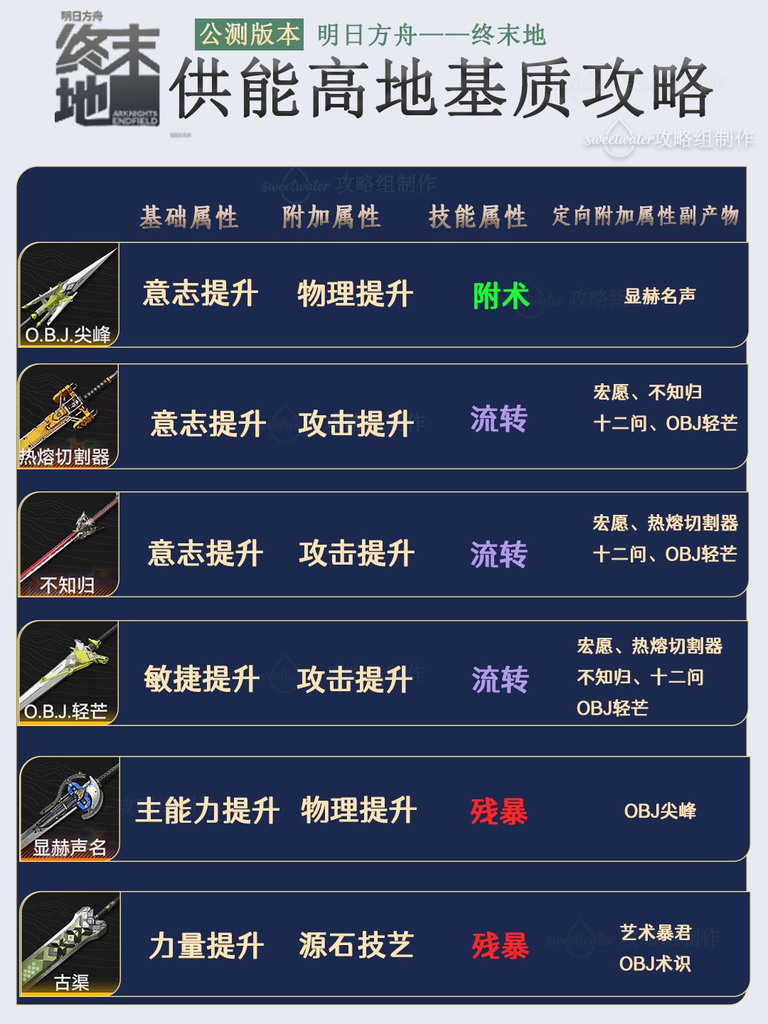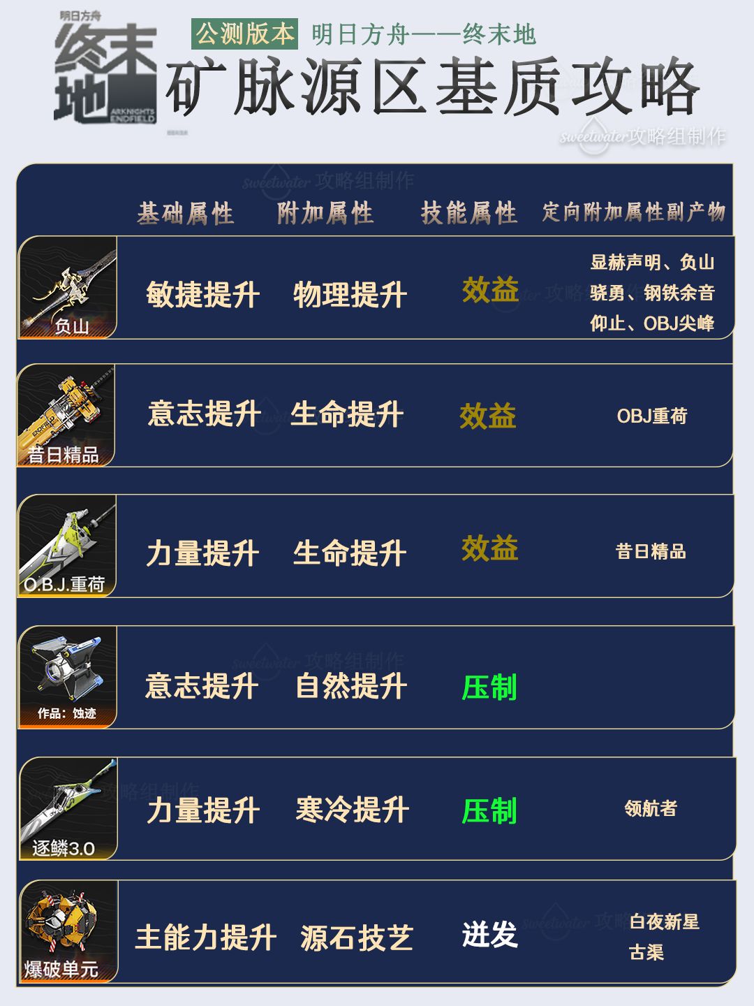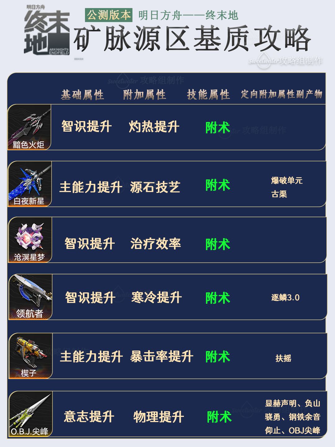 列出了每个能量淤积点所掉落基质对应六星和五星的武器