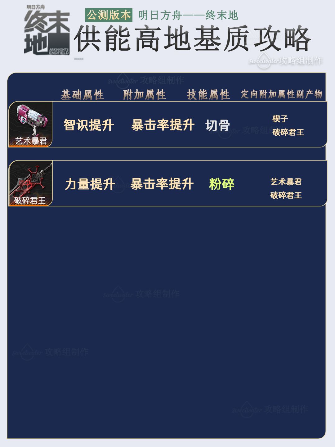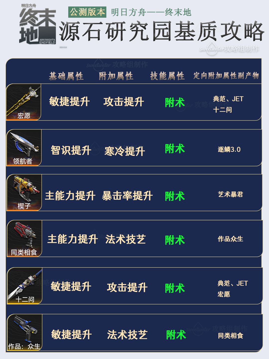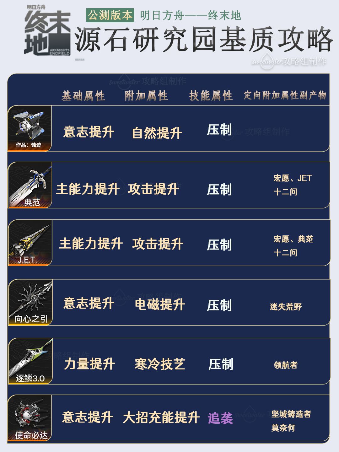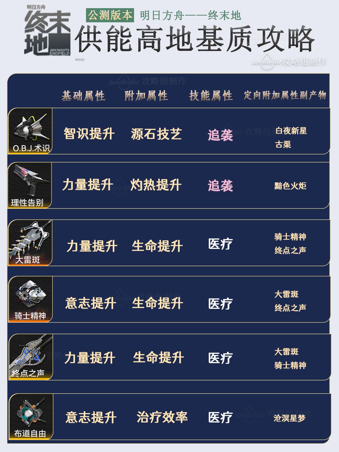 列出了每个能量淤积点所掉落基质对应六星和五星的武器