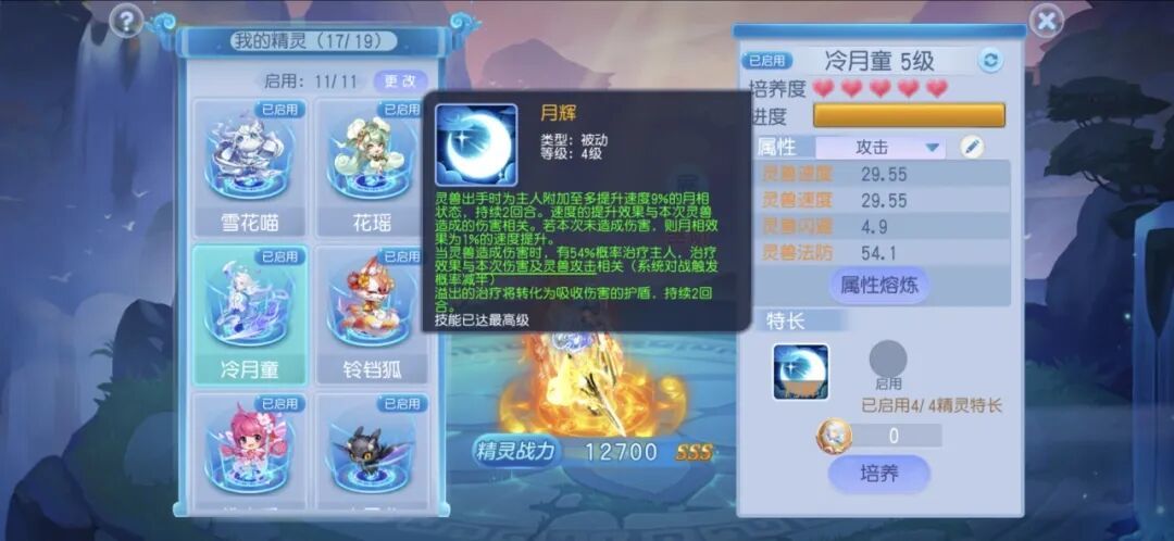 精灵搭配:冷月童。被动“月辉”——按宠物输出比例给你速度: