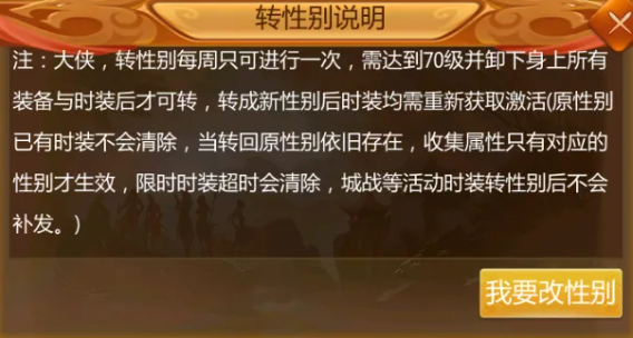 此次更新商城将新增变性丹道具,使用时不能是预言宝贝及结婚状态。注:转性别每周只可进行一次,需达到70级并卸下身上所有装备与时装后才可转,转成新性别后时装均需重新获取与激活(原性别已有时装不会清除,当转回原性别时依旧存在,收集属性只有对应的性别才生效,限时时装超时会清除,城战等活动时装转性别后不会补发,请谨慎使用变性丹。),如果两个性别都有时装激活,均会保留,但只会生效与显示当前性别已激活时装与收集属性。