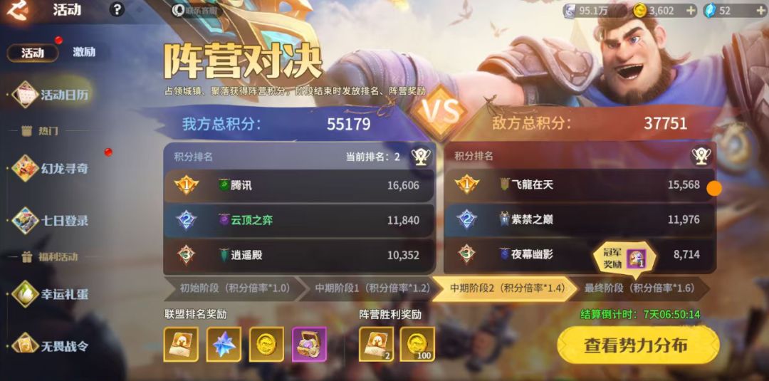 面对两线压力,【飞龍在天】 果断采取收缩策略,暂时放弃应对 【腾讯】 联盟方向的进攻,集中力量维持对 【紫禁之巅】 的压制。而 【云顶之弈】 与 【紫禁之巅】 见状也随之调整部署,并未固守原防区。
