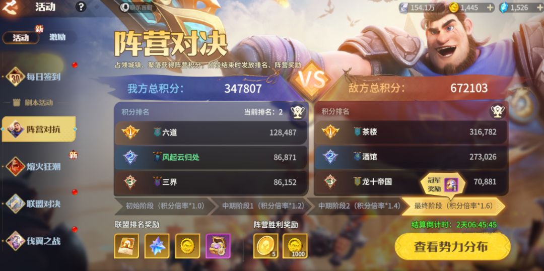 本区服经过高强度激战,【茶楼】联盟在占据优势的情况下主动提议停战,近期各盟已开始休养生息。