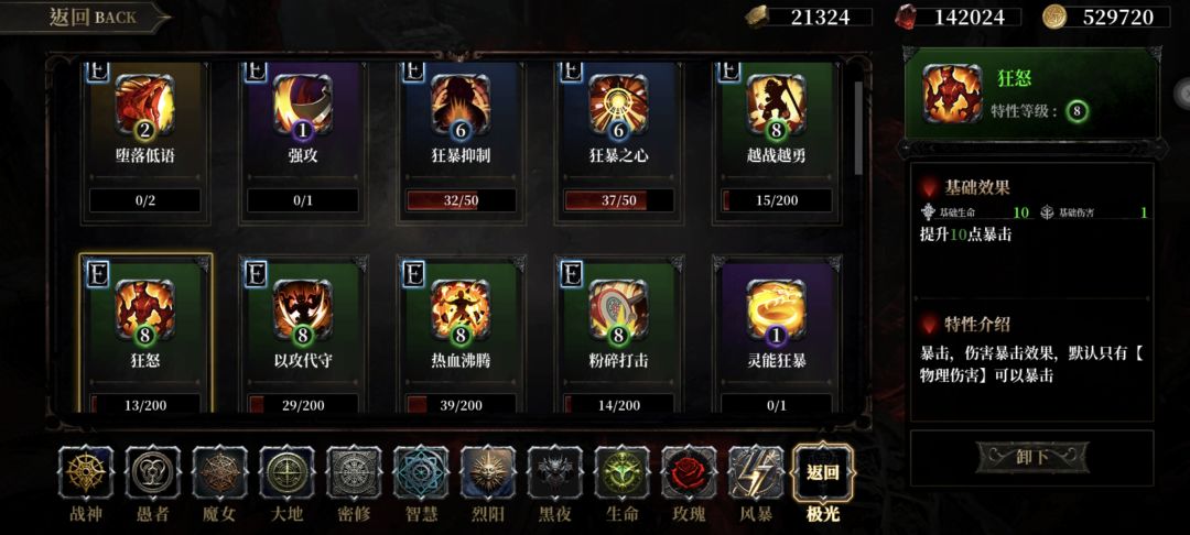 极光(暴击):强攻、狂怒;越战越勇(核心特性,触发暴击回复生命)、以攻代守、热血沸腾(核心特性,获得巨量怒气)、粉碎打击。