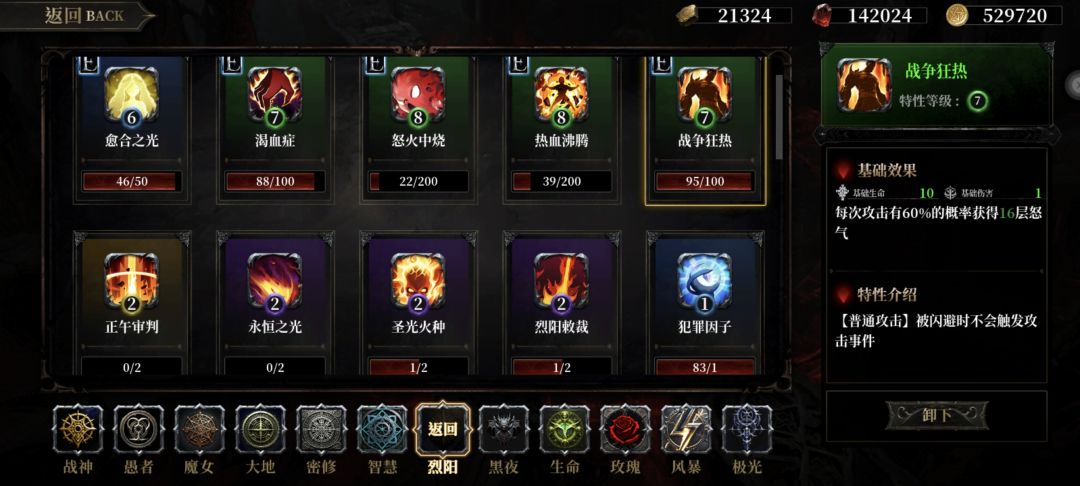 特性撘配:烈阳(怒气):怒火中烧、愈合之光、热血沸腾、战争狂热这几个必带,其他还有获得护盾、寒霜、易伤加怒气的自己根据自己特性等级看情况,总之先把攻速叠起来才行。