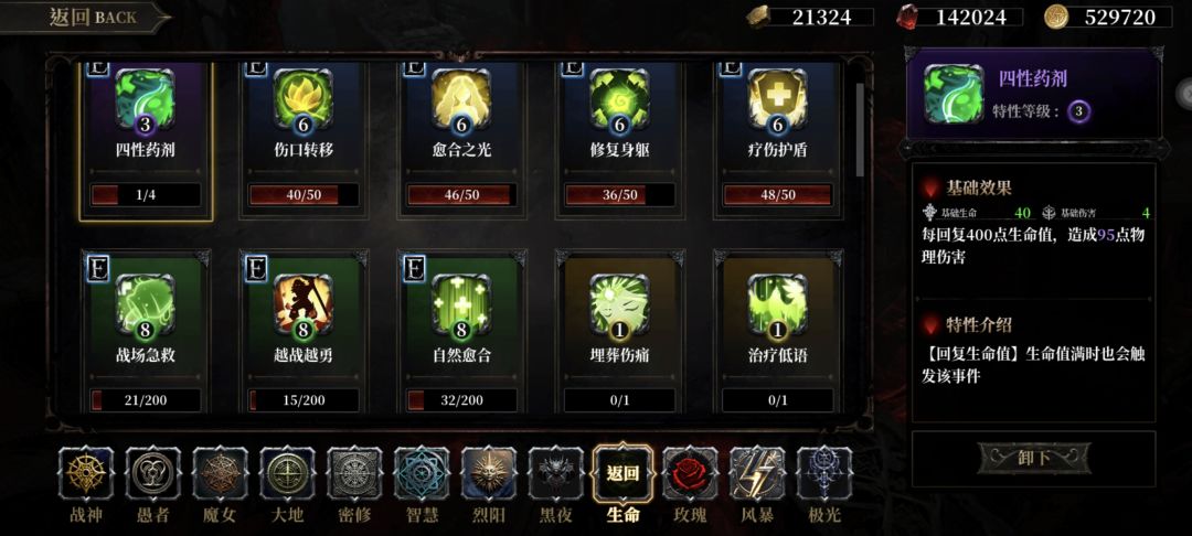 生命(回复):自然愈合、修复身躯、光合作用、战场急救。目的是为了触发回复获得属性。有啥带啥。