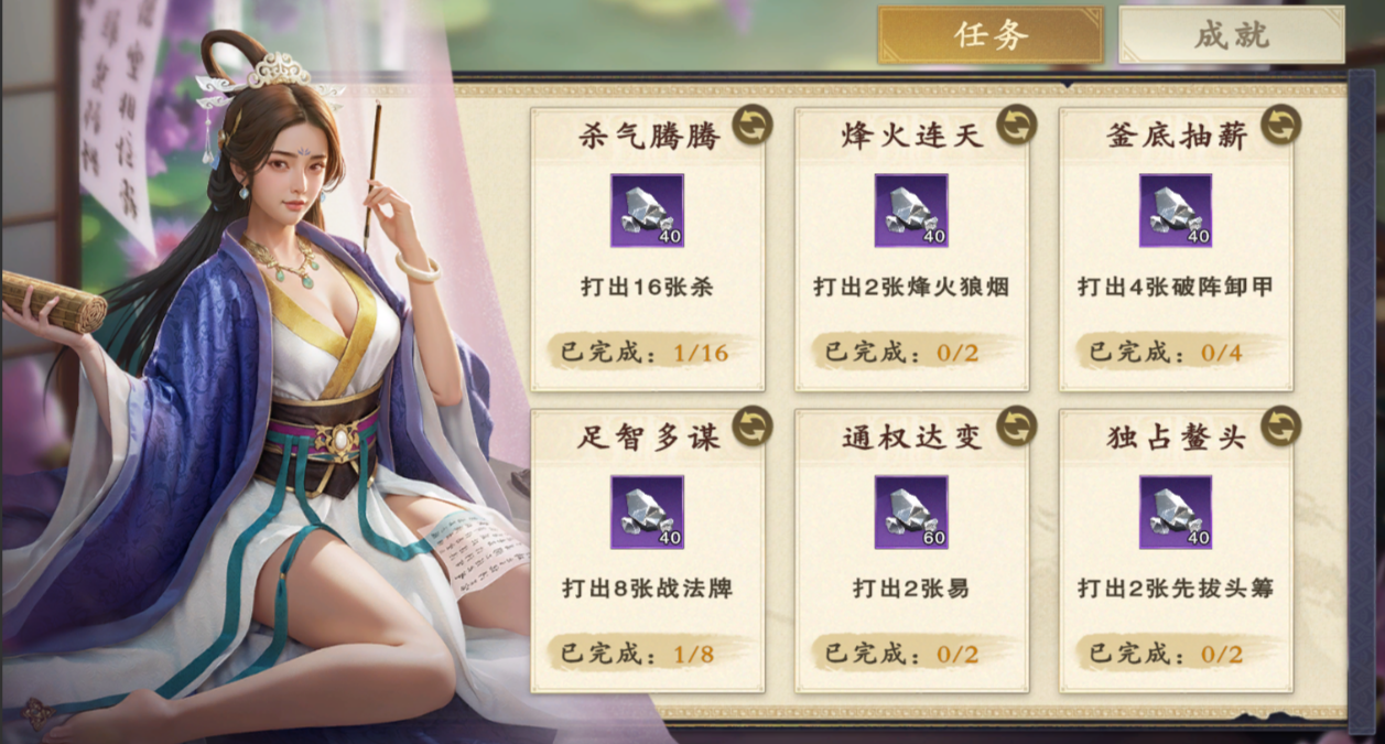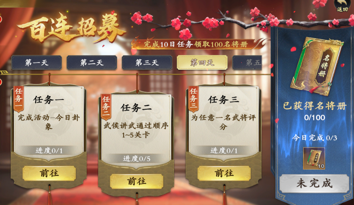 首次登录游戏后,完成每日任务就可获得10个名将册,10日任务共可获取100名将册。瞬间觉得300抽的“进度”完成一大半,有没有!?