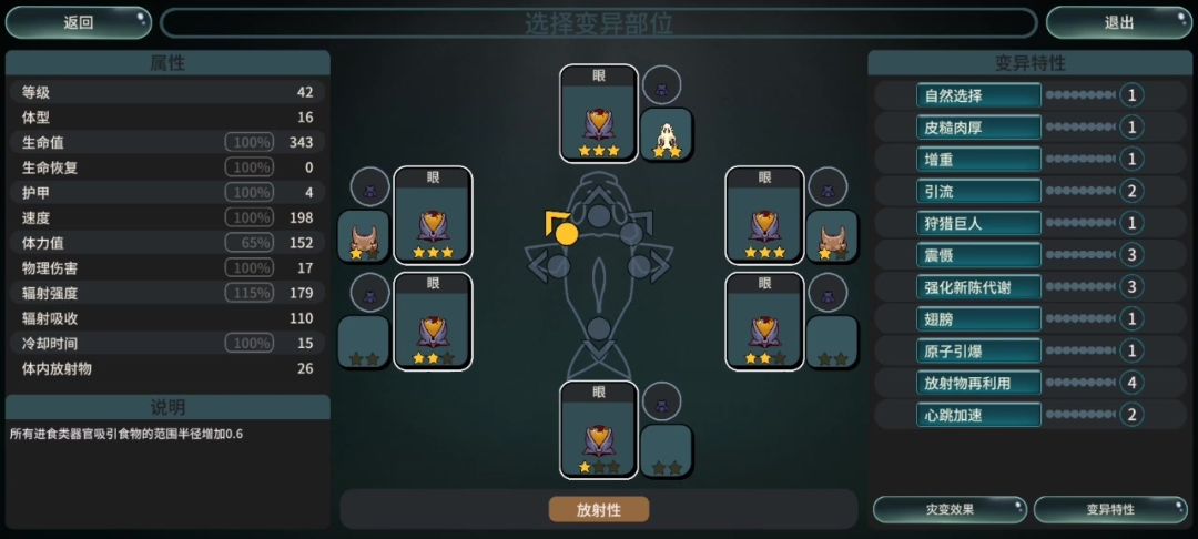 随便装器官,不用担心掉血;免疫环境辐射伤害,快速吃经验,还能消耗其他npc小鱼。最重要的是,它能无伤吃放射物!唯一的缺点就是脆,走位一定要小心!