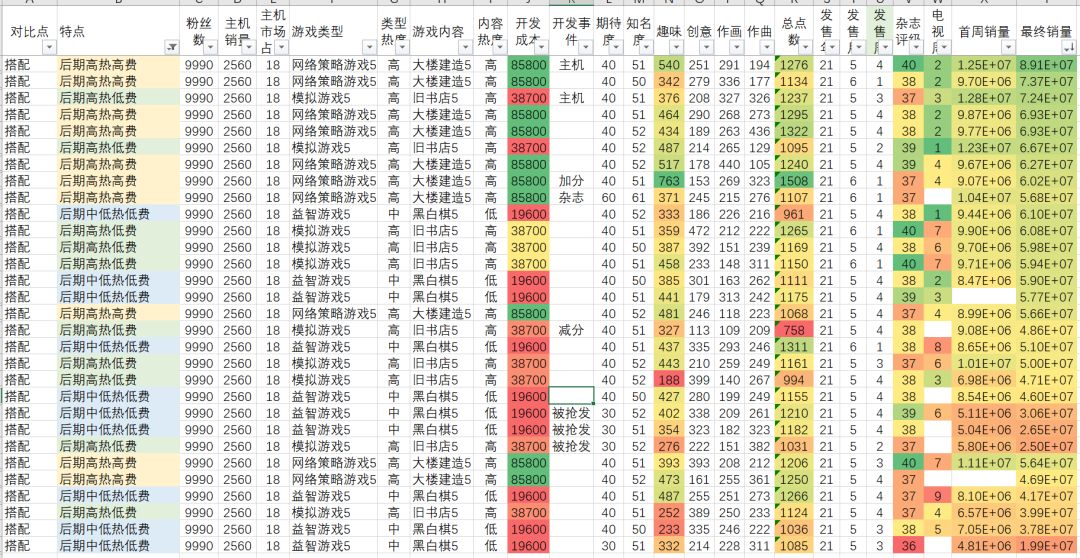 一句话结论:选择高销量主机,注意发售时间在6月4周或11月4周(这里有发售后第一周事件比7.1发售销量高不少),尽量提高四维,开发中主机事件尽量刷,尽量少bug,40、80、100注意不要被暴发拖时间,杂志评级尽量38以上,评级后,发布后,发售前300*4广告,尽量在发布第一周刷出电视事件,注意带bug发布导致的中断销售事件